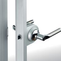W drzwiach ze szkła hartowanego możemy zamontować zamki według wymagań klienta. Zawiasy drzwi montujemy do ościeżnicy zamocowanej na kwadratowym słupie.